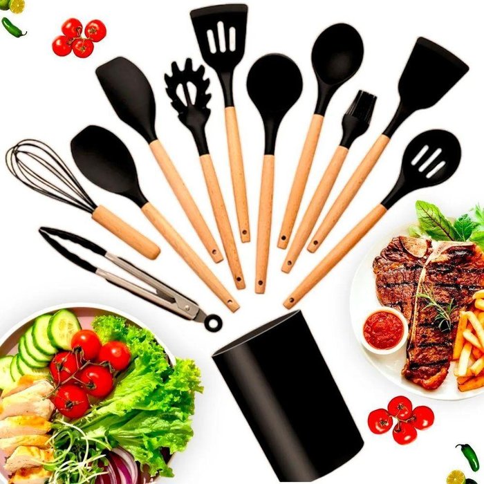 Kit Utensílios Cozinha Silicone Colher Copo Suporte 12 Peças