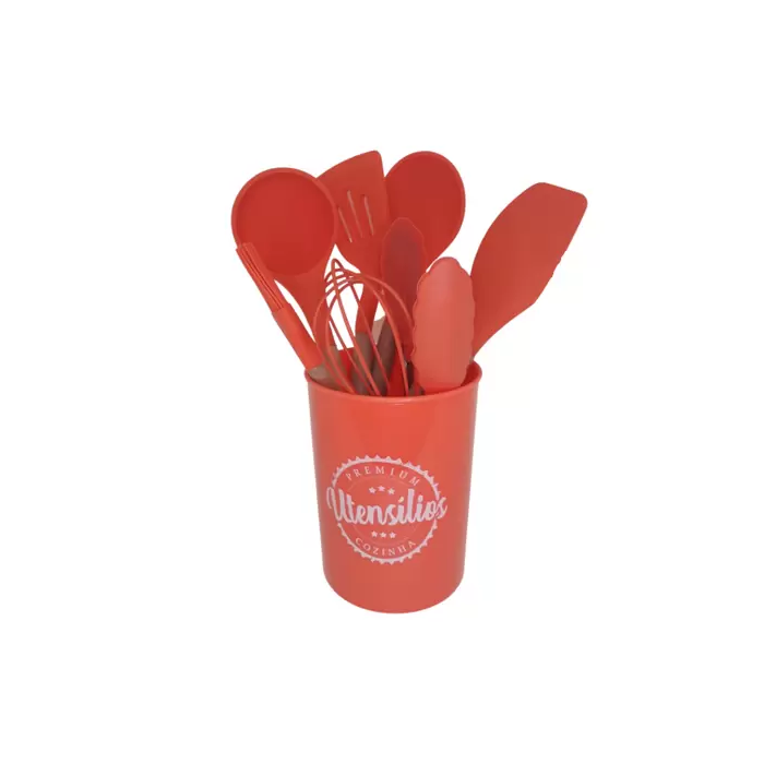 Kit Utensílios Silicone Com Cabo De Madeira 9 Peças Laranja