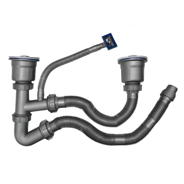 Kit para Cuba Dupla de Cozinha, Válvulas, Tubos, Sifão e Dreno - Acabamento Escovado