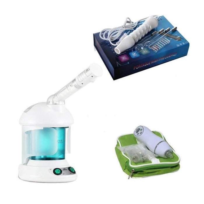 O kit dos sonhos quando o assunto é tratamento e beleza da pele, composto por 3 super produtos de alta qualidade e eficácia, o primeiro é a máquina facial com vaporizador de ozônio que limpa e clareia a pele. O segundo é o peeling diamante que promove um tratamento de renovação celular que devolve a elasticidade, clareia as manchas, diminui a oleosidade e a acne. É ainda menos agressivo que alguns peelings químicos. E pra fechar com chave de ouro, o exclusivo aparelho alta frequência com 4 eletrodos. Ele é utilizado em tratamentos faciais, capilares e podologia. O alta-frequência é uma corrente de elevada tensão e de baixa intensidade que é aplicada sobre o organismo humano através de eletrodos de vidro que se fixam a uma bobina, apresentando diversos efeitos fisiológicos sobre o organismo humano e daí a sua importância como recurso auxiliar em diversos tratamentos na estética.