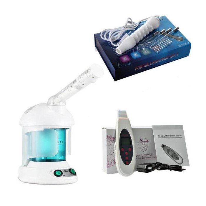 O kit dos sonhos quando o assunto é tratamento e beleza da pele, composto por 3 super produtos de alta qualidade e eficácia, o primeiro é a máquina facial com vaporizador de ozônio que limpa e clareia a pele. O segundo é o peeling ultrassônico que é uma ferramenta utilizada na purificação e limpeza de pele, através de ultrassom. Permite um regime de cuidados da pele sem ser agressivo e invasivo, sendo totalmente indolor. E pra fechar com chave de ouro, o exclusivo aparelho alta frequência com 4 eletrodos. Ele é utilizado em tratamentos faciais, capilares e podologia. O alta-frequência é uma corrente de elevada tensão e de baixa intensidade que é aplicada sobre o organismo humano através de eletrodos de vidro que se fixam a uma bobina, apresentando diversos efeitos fisiológicos sobre o organismo humano e daí a sua importância como recurso auxiliar em diversos tratamentos na estética.