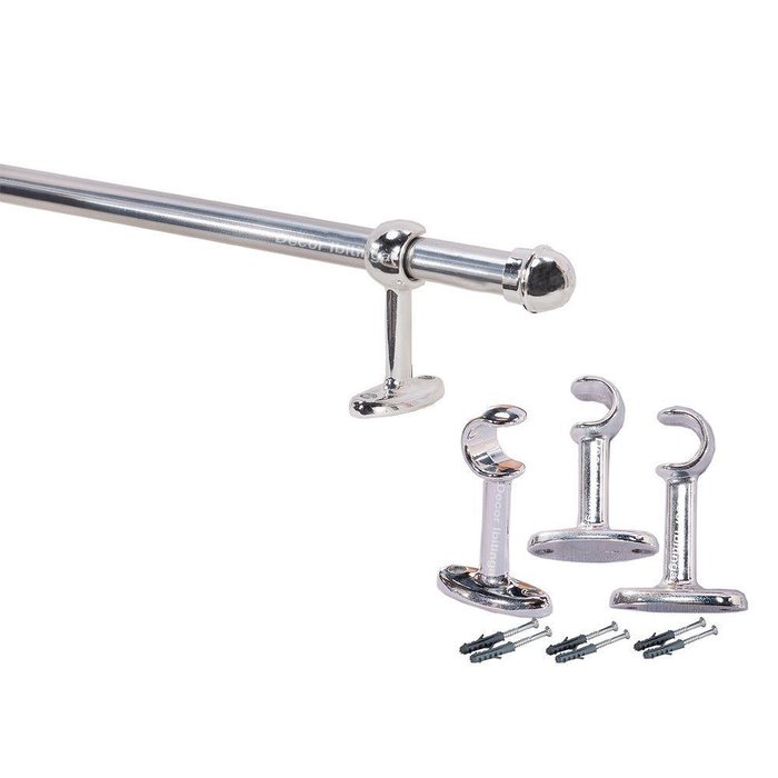 Contém:1 Varão de 3 ;mts divididos em 3 ;partes de 1 mt com 19mm de diametro3 Suportes simples de 19mm em Alumínio Maciço2 Ponteiras*Parafusos e buchas para fixação