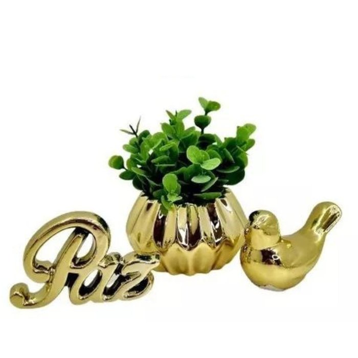 Kit Vaso + 1 Passarinho + Palavra Paz Decorativa DOURADO