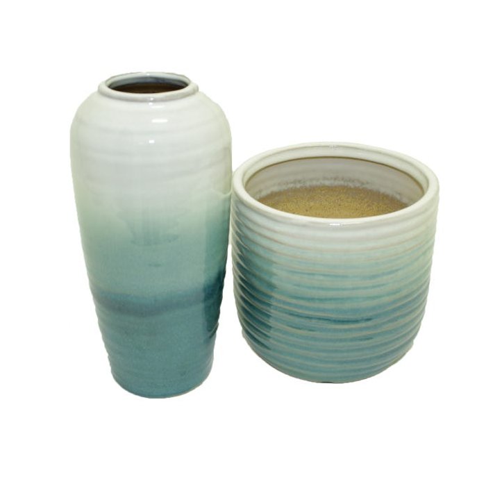 Kit Vaso em Cerâmica Bege e Azul Claro