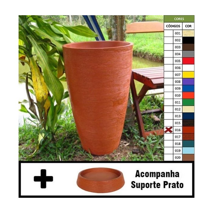 Vaso com Prato Oval Moderno 65x40 Dimensões aprox.: Altura: 65 cm Larg.: 40 cm Compr.: 40 cm Peso: 2 kg Volume: 53 litros Material: Polietileno Textura: Estilo Grafiato Material de Ótima Qualidade, Resistente ao Sol e Chuva. Resistente a Impactos, Extremamente Durável. Suporta Umidade, Maresias, Poeiras, não Prolifera Fungos e Bactérias. Higiênico, pode ser Lavado e não Descasca por não haver Tinta. Vaso Lindo com Ótimo Trabalho de Acabamento e Design. Obs.: Anúncio refere-se somente ao vaso, não estão inclusos demais itens e fotos meramente ilustrativas.
