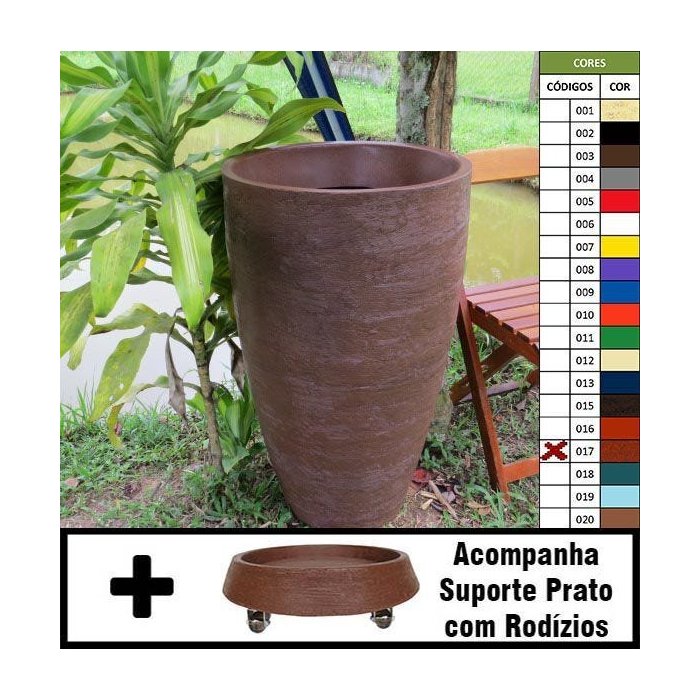Vaso + Prato com Rodízios Silicone Oval Moderno 80x50 Dimensões aprox.: Altura: 80 cm Larg.: 50 cm Compr.: 50 cm Peso: 3,5 kg Volume: 95 litros Material: Polietileno Textura: Estilo Grafiato Material de Ótima Qualidade, Resistente ao Sol e Chuva. Resistente a Impactos, Extremamente Durável. Suporta Umidade, Maresias, Poeiras, não Prolifera Fungos e Bactérias. Higiênico, pode ser Lavado e não Descasca por não haver Tinta. Vaso Lindo com Ótimo Trabalho de Acabamento e Design. Obs.: Anúncio refere-se somente ao vaso, não estão inclusos demais itens e fotos meramente ilustrativas.