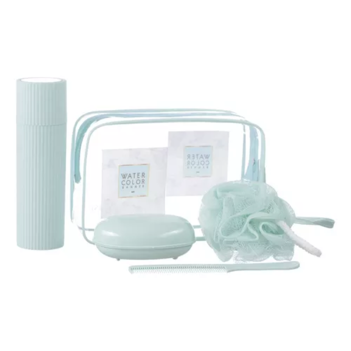 Um lindo kit de banho essencial para manter o armazenamento de seus itens de higiene e a praticidade no transporte. Contendo uma bolsa transparente com alça, uma esponja com alça, um pente, um porta escova e pasta com espelho em sua tampa e uma saboneteira;