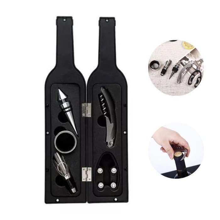Kit Vinho 5 Peças Inox Garrafa - Completo e Elegante para os Amantes de Vinhos!Este sofisticado Kit Vinho 5 Peças Inox em formato de garrafa é o presente ideal para os apaixonados por vinhos e perfeccionistas da degustação. O Kit para vinho é feito em aço inoxidável, garante durabilidade e um design moderno que impressiona. Em uma apresentação compacta e estilosa, o kit se adapta bem a qualquer ambiente e é fácil de transportar e armazenar. Ideal para momentos especiais ou como presente para alguém especial.O kit é completo e traz tudo o que você precisa para saborear o vinho com perfeição. Ele inclui um saca-rolhas resistente para facilitar a abertura, uma tampa com vedação de alta qualidade, um aerador para potencializar o sabor e aroma da bebida, um corta-lacre prático e um anel antigotejamento para evitar derramamentos. Todas as peças são organizadas de forma prática dentro da “garrafa”, que mantém tudo seguro e ao seu alcance.Transforme suas experiências com vinhos! Este Kit Vinho 5 Peças Inox é mais do que um simples conjunto de acessórios – é uma experiência completa para qualquer entusiasta de vinhos. Elegante e funcional, ele proporciona praticidade e sofisticação em cada detalhe. Adquira agora e aproveite seus momentos de degustação com ainda mais estilo e eficiência!Especificações:Material: Aço inox e PlásticoCor: Preto foscoKit: 1 Cortador de Lacre, 1- Canivete saca rolhas, 1 bico dosador, 1 tampa para vinho, 1 anel corta gotasGarrafa possui 33 cm de alturaAdquira agora e aproveite seus momentos de degustação com ainda mais estilo e eficiência!
