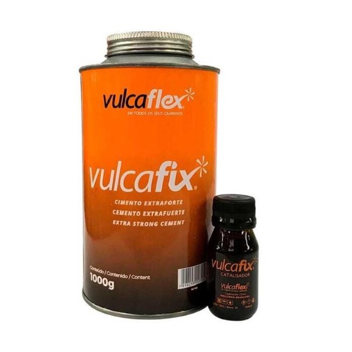 kit Vulcafix Adesivo 1000g e Catalisador 25g é um cimento vulcanizante para aplicação a frio com ótimo custo benefício. Utilizado para diversas aplicações em substratos de borracha e em inúmeros tipos de superfícies tratadas, como por exemplo: metálicas,madeira, tecido ou couro.