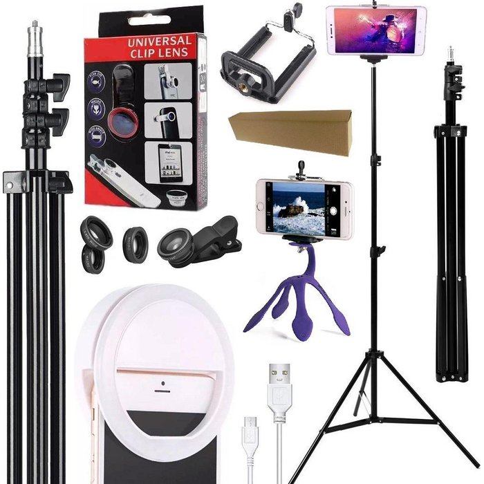 Kit youtuber tripé profissional pedestal celular luz led flash ring light clip iluminador kit lentes olho peixe suporte
