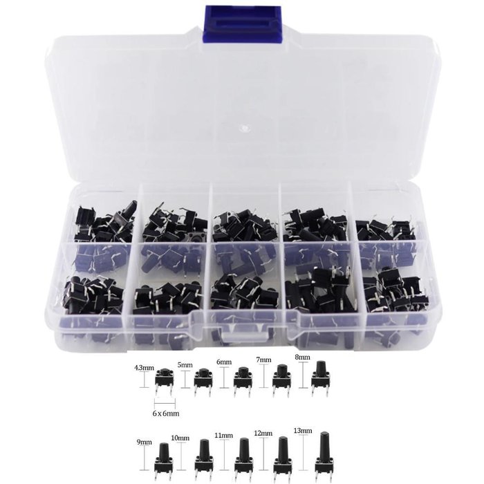 Tamanho do interruptor: 6x6mm, tamanho do botão: 4.3mm / 5mm / 6mm / 7mm / 8mm / 9mm / 10mm / 11mm / 12mm / 13mm