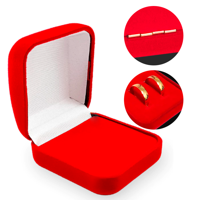 Embalagem de veludo para anéis ou aliançasExterno revestido em veludo vermelho.Suporte para 2 anéis alianças.Qualidade extrema.Altura: 3,5 cmLargura: 5,0 cmProfundidade: 5,5 cmObrigada pela preferência e boas compras!