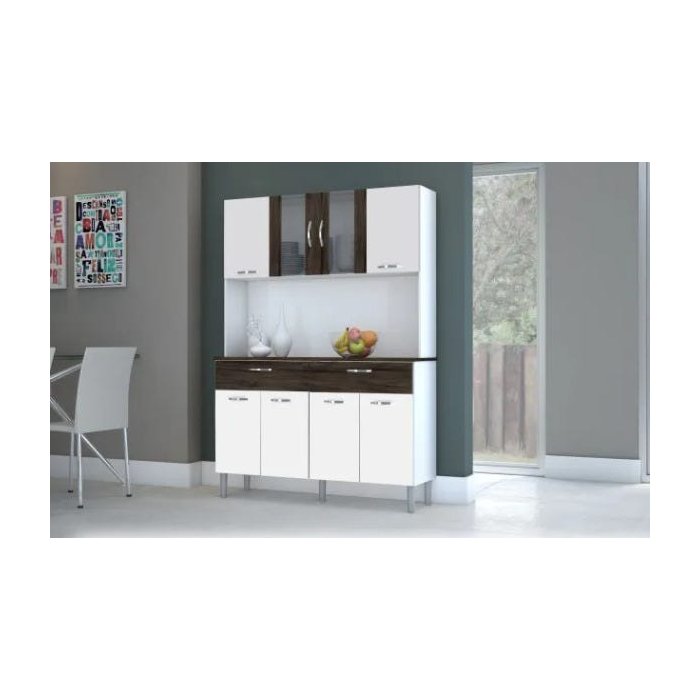 oito portas, sendo duas portas superiores com vidro temperado e duas gavetas. Nas portas e gavetas são utilizadas