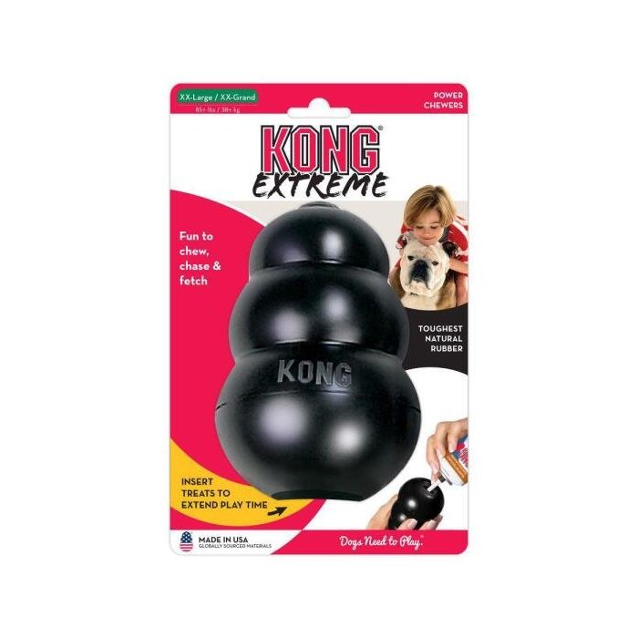 KONG EXTREME é Indicado por veterinários, adestradores, treinadores e clientes satisfeitos pelo mundo. A versão EXTREME do KONG foi feita para cães destruidores e devoradores. Brinquedo de borracha que os cães adoram, que é extremamente resistente. Ele é usado para combater o tédio, a ansiedade de separação, gastar a vontade do cachorro de morder e destruir objetos, etc.. Promovem entretenimento, enriquecimento ambiental, ajudam em problemas comportamentais e muito mais Feito de borracha atóxica e muito resistente, seu interior é oco para guardar biscoitos, petiscos ou material impregnado do odor que o cão deve identificar durante a sua busca. Seu formato irregular, faz com que o brinquedo KONG EXTREME pule de um lado para outro, de forma imprevisível, estimulando ainda mais o prazer que o seu cão tem em capturar a presa. Usado por treinadores profissionais e policiais, para recompensar cães que farejam drogas, que defendem e patrulham território,ou que ajudam a encontrar e prender criminosos. O KONG EXTREME exercita a mandíbula de nossos pequenos caçadores, ajudando a manter as gengivas saudáveis (não machuca), sem ser abrasivo e agressivo com os dentes. Cuidado com as imitações baratas. Só o KONG ORIGINAL é a marca conhecida e usada mundialmente por profissionais e recomendada por treinadores. Tamanho Extra Extra Grande - Indicado para cães com mais de 38 kg. Ex:akita, Bernese Montês, Buldogue, Dobermann Pinscher, Dogue Alemão, Golden Retriever, Labrador Retriever, Mastife, Pastor Alemão, Pit Bull, Rhodesian Ridgeback, Rottweiler, São Bernardo, Terra Nova, Weimaraner Medidas aproximadas do produto - Comprimento: 9,9 cm - Altura: 15,2 cm - Largura: 9,9 cm - Peso: 540 g