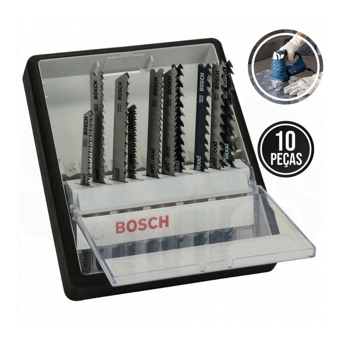 Descrição Distribuído por Casa das Serras: Características: - O Jogo de lâminas para serra tico tico encaixe T com 10 peças da Bosch, pertence á linha Wood Expert, Robust Line e é a escolha certa para você que realiza trabalhos em madeira. O jogo conta com uma seleção de lâminas que possibilitam qualquer trabalho, ideais para cortes retos e curvos e proporcionam resultados precisos, rápidos e limpos em madeira dura e outras madeiras. Especificações: - Número de peças: 10; - T 101 AO para madeira; - T 101 B para madeira; - T 101 BR para madeira; - T 101 AOF para madeira dura; - T 101 BF para madeira dura; - T 101 BRF para madeira dura; - T 244 D Velocidade para Madeira; - T 144 D Velocidade para Madeira; - T 144 DF Velocidade para Madeira Dura; - T 144 DP Precisão para Madeira; - Dimensões do produto: 45.01 x 40.01 x 24.99 cm; - Peso: 160 g. IMAGEM MERAMENTE ILUSTRATIVA