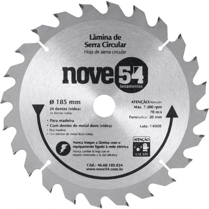 Indicada para cortar madeiras e derivados. Nunca exceder a rotação máxima (rpm) - risco de acidente e/ou queima da lâmina. Não cortar madeiras impregnadas com massa ou cimento.