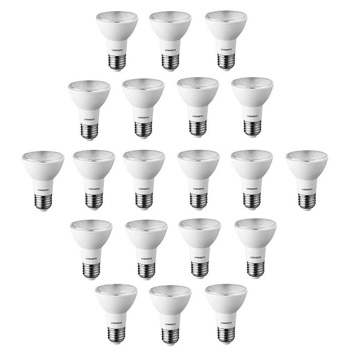 Lâmpada de Led Amarela Par20 LorenLed 7w - Lorenzetti A lâmpada Par20 é indicada para destacar objetos e iluminar vitrines, jardins de inverno, lojas e restaurantes. Possuem alta durabilidade e dimensões reduzidas. São testadas e aprovadas pelo Inmetro. - Características * Tensão: 127v - 220v * Frequência nominal: 60 Hz * Base: E27 * IRC: 80 * Vida Útil: 25.000 horas * Luz Amarela * Temperatura da Cor: 2.700 K * Equivalente a uma lâmpada incandesente de 50W * Fluxo Luminoso: 525 lm * Dimenções: 63 x 81,5mm 20 Unidades Garantia: 2 anos NA