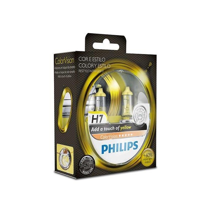A Philips ColorVision permite adicionar um toque personalizado de cor às luzes do seu carro. Escolha entre azul, verde, amarelo e roxo, e personalize o seu automóvel. As lâmpadas ColorVision estão em conformidade com todos os regulamentos legais Tipo de lâmpada: H7 Embalagem c/: 2 12 V, 55 W