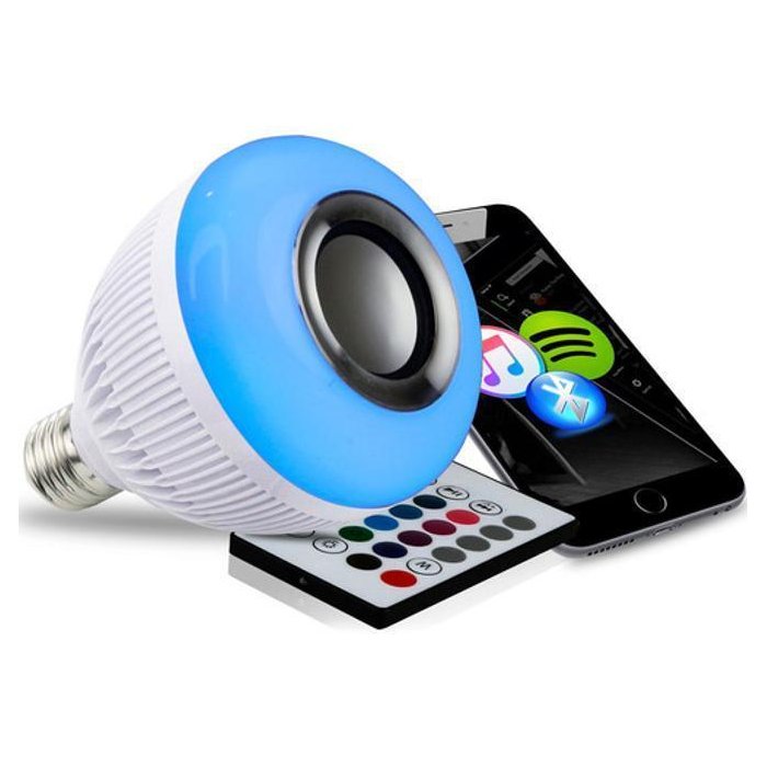 Lâmpada bulbo 12W de Potência que toca música e ainda tem controle remoto com 24 funções e 16 cores.