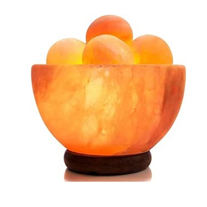 Lâmpada de Sal Marinho Natural do Himalaia com 6 Bolas de Massagem com Sal Aquecido, Base de Madeira