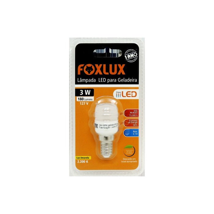Lâmpada LED Geladeira 3W E14 220V Amarela - FoxluxIluminação eficiente e durável para sua geladeira!Descrição do Produto:A Lâmpada LED Geladeira 3W E14 220V Amarela da Foxlux é a solução perfeita para iluminar sua geladeira com eficiência e durabilidade. Com uma potência de 3 watts e um formato compacto com soquete E14, esta lâmpada LED oferece uma luz amarela suave que melhora a visibilidade interna, ideal para ambientes refrigerados.Características:Potência: 3WTipo de Lâmpada: LEDSoquete: E14Voltagem: 220VCor da Luz: AmarelaIdeal para: Geladeiras e outros eletrodomésticosCódigo do Fabricante: LEDG3.2Código: 30661Código NCM: 85391010Código de Barras da Caixa: 7898586134270Marca: FoxluxBenefícios:Eficiência Energética: Consome apenas 3 watts, oferecendo uma iluminação eficiente com baixo consumo de energia.Durabilidade: Tecnologia LED de alta qualidade para uma longa vida útil, reduzindo a necessidade de substituições frequentes.Iluminação Suave: A luz amarela proporciona um ambiente acolhedor e confortável, ideal para ambientes internos refrigerados.Compatibilidade: Soquete E14, compatível com a maioria das lâmpadas para geladeiras e eletrodomésticos.Aplicações:Ideal para uso em geladeiras e outros eletrodomésticos que necessitam de iluminação interna. A lâmpada LED proporciona uma luz eficiente e durável, melhorando a visibilidade e a funcionalidade do seu equipamento.Benefícios da Lâmpada LED Foxlux:Economia de Energia: Menor consumo elétrico comparado às lâmpadas incandescentes tradicionais.Maior Vida Útil: Menos trocas e manutenção, oferecendo economia a longo..Luz Aconchegante: A luz amarela cria um ambiente confortável e agradável.A Lâmpada LED Geladeira 3W E14 220V Amarela da Foxlux é a escolha ideal para quem busca eficiência e durabilidade na iluminação de eletrodomésticos. Garanta a sua e experimente a qualidade superior da iluminação LED!