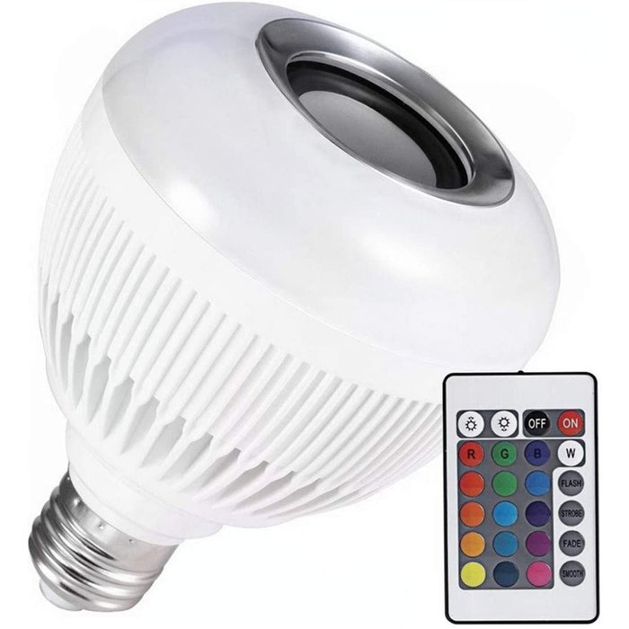 Lâmpada Led Musical Rgb Bluetooth Controle Remoto 8 CoresCom as Lâmpadas Led Musical Bluetooth a diversão é inevitável, com seu Controle remoto com várias funções.Permite trocar as músicas, pausar e controlar o volume do som.Permite alterar as cores e a intensidade da luminária com funções que permitem piscar a luz estilo balada trocar cores rápida e lentamente proporcionando um ambiente personalizado com as 13 cores disponíveis em uma mesma lâmpada.Lâmpada de Led com Caixa de som e controle remoto.Diversão garantida pra toda família.Especificações:Voltagem - Bivolt 100V – 240VReprodução de Músicas Através de BluetoothPotência Total - 12WPotência LED - 7WPotência Alto Falante - 3WFrequência - 135Hz - 15KHzControle Remoto: 10 Metros de alcanceConexão Bluetooth - Versão Wireless - 4.0Compatível com Android e IOS.Medidas Aproximadas (DxA): 9,5cmx12,5cmPeso aproximado: 260 gContém:- 1 Lâmpada Bluetooth Musical RGB- 1 Controle RemotoEspecificações Técnicas:Garantia contra defeito de fabricação:7 dias.
