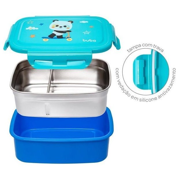 Possui um compartimento interno de aço inoxidável com divisória ajustável para separar os alimentos.
