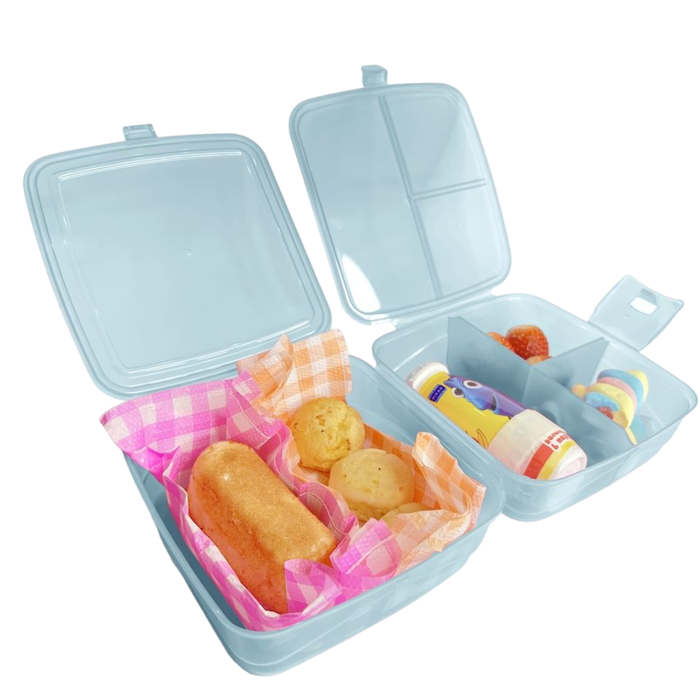 Lancheira Dupla Com Divisórias Plástico Cores KeitaCom a Lancheira Dupla você pode dividir suas refeições de maneira práticaTemos um compartimento no tamanho 14x13x4cm ideal para você colocar sanduíches, tem o tamanho perfeito para pão de formaNo outro compartimento temos 3 divisórias sendo 2 no tamanho 6,5x6,5x4cm ideal para colocar amendoins, balas de goma, futas e 1 compartimento no tamanho 13x7x4cm ideal para colocar sucos de caixinhas, potes de leite fermentado e/ou bebidas lácteas.