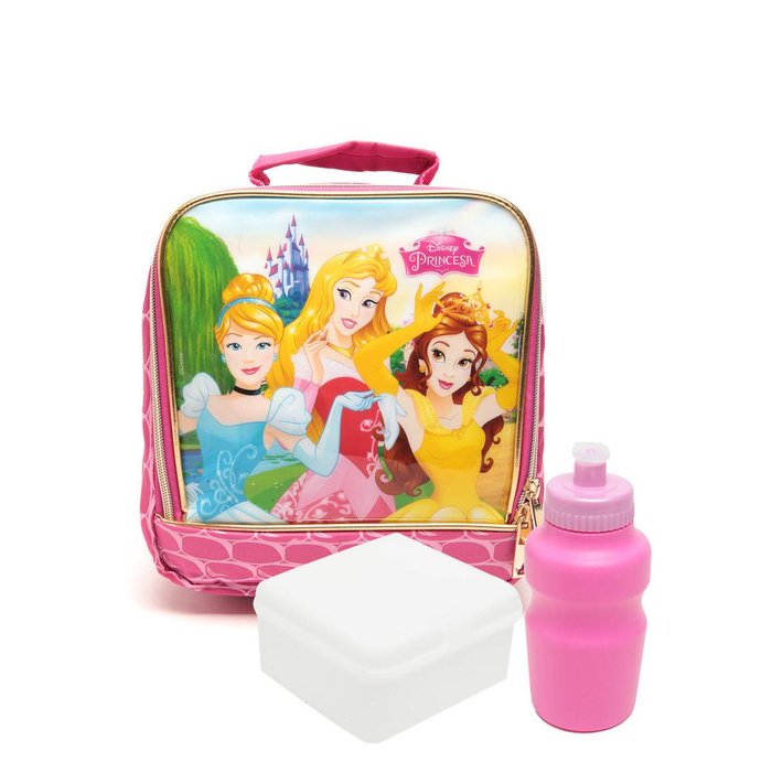 Lancheira Dermiwil Infantil Princesas Cenário Rosa, com estampa frontal das personagens Bela, Aurora e Cinderella, revestimento interno térmico, pendurador, fecho em zíper e alças reguláveis Acompanha pote e garrafa