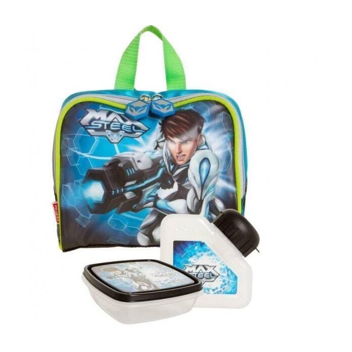 A lancheira do Max Steel acompanha garrafinha e potinho de plástico estilizado com a identidade do super-herói. O pequeno espião vai poder guardar o seu lanchinho com segurança para comer na hora que quiser