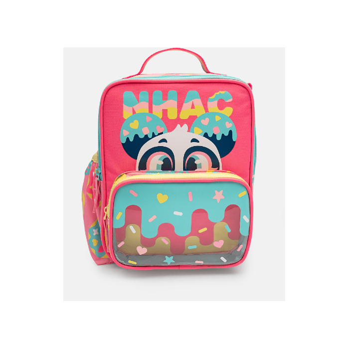 Lancheira em nylon, sem gel, com forro térmico e estampa de Panda. Possui bolso frontal médio em PVC transparente com estampa localizada. Alça de mão fixa e alça de omrbo com regulagem. Tamanho: Único Medidas: 20cm x 23cm x 13cm (LxAxP) Cor: Rosa Indicado para: Crianças / adolescentes / adultos Ocasião: Escolar / passeio / trabalho Material externo: Poliéster (nylon) Material diferenciado: PVC transparente Material Interno: PEVA térmico Alça de ombro fixa ajustável e de mão fixa Fechamento com zíper Capacidade: 2,5 litros Peso suportado: 1 kg Peso do produto: 300g Compartimentos: compartimento principal grande e 1 bolso frontal médio. Limpeza e conservação: Para limpeza, não lavar com escova abrasiva; lavar à mão com sabão neutro e água corrente; lavar separadamente as cores fortes das claras; não utilizar produtos abrasivos como cloro e água sanitária; não deixar a peça de molho; secar à sombra; não passar o ferro.
