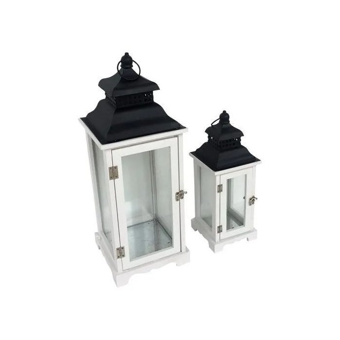 Conjunto com duas lanternas em madeira de pinus na cor branca e cúpula em aço inoxidável na cor rose gold.