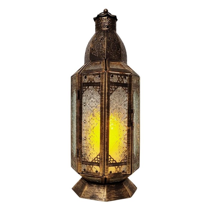 Ideal para uso em salas, varandas, halls de entrada, eventos, festas ou decoração temática, a lanterna possui abertura frontal com trava para acesso à vela e alça metálica superior, permitindo que seja usada sobre mesas ou pendurada.