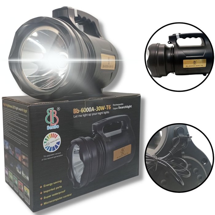 | Modelo | Lanterna Holofote Regarregável com Alça - Super Potente Led T6 - Caça, Pesca, Camping, Trilhas Noturnas - 6000A 30W BenBo |