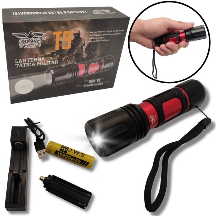 | Modelo | Lanterna Tática Militar Recarregável Super Forte E Potente - 4 Janelas XML T9 JY-9817 - 5400000 Lumens - Para Caça, Pesca, Camping, Trilhas Noturnas - |