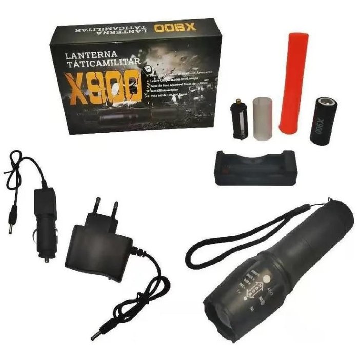 Lanterna Tática Militar X900 Zoom Bateria Recarregável Lanterna Tática Militar Características do produto: Leve e compacta Feixe de foco ajustável Zoom de 1-2000x Sos Estroboscópico Produto de ótima qualidade Modelo: X900 Fácil Manuseio Cor: Preto Itens Inclusos: 1 Lanterna de Led Recarregável - 2.800.000 Lumes 1 Bateria Recarregável 1 Adaptador para usar com baterias 18650 1 Fonte Bivolt 1 Carregador Veicular Perfeita para usar em situações táticas ou em atividades ao ar livre. A lanterna tem ótima qualidade, é versátil e capaz de impressionar com a sua potência de longo alcance. Essa ferramenta é indispensável para atividades como montanhismo, trilhas, escalada, camping, sobrevivência, caminhadas, pescaria, patrulha, policiais, bombeiros e etc.
