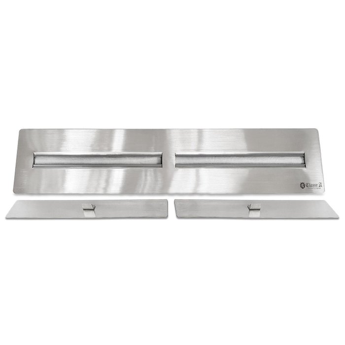 Obrigatório a instalação de vidro temperado 8mm de 100cm x17cm (vendido separadamente) em uma ou duas laterais do queimador. Ele controla o fluxo de ar sobre a chama mantendo-a reta para cima. Sua não colocação pode ocorrer superaquecimento da chapa de inox e causar fissura na pedra.