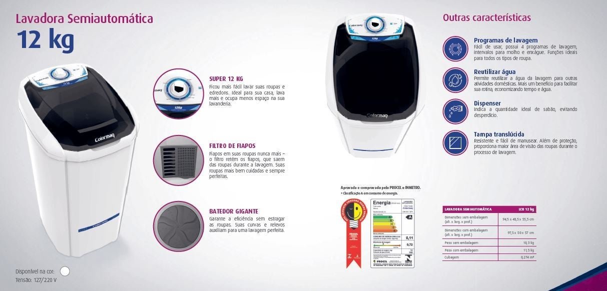 Lavadora Semiautomática 12kg Colormaq 220V Branco