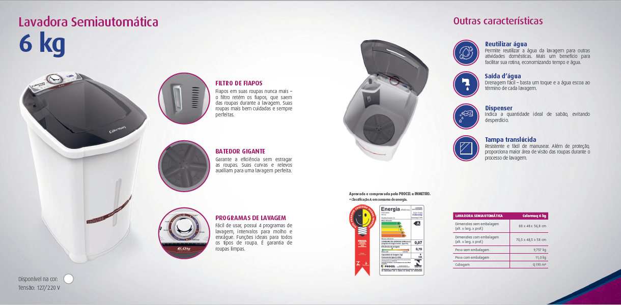 Lavadora Semiautomática 6kg Colormaq 127V Branco