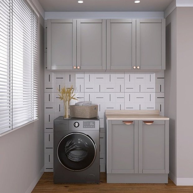 Lavanderia Modulada 3 Peças 2 Armários Aéreos 4 Portas 1 Balcão CabeCasa MadeiraOriginals Cinza/Branco