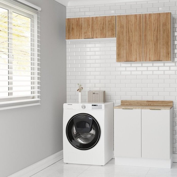 Lavanderia Modulada 3 Peças 2 Armários Aéreos 4 Portas 1 Balcão Ipanema CabeCasa MadeiraOriginals Branco/Acácia