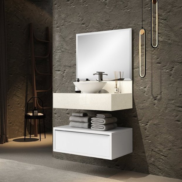 GABINETE fabricado em MDF e MDP BP (15 mm), puxadores de alumínio anodizado, gavetas com corrediças telescópicas. Portas com dobradiças grandes (35 mm). Gaveta com divisores, mais higiênico organizador dental (removível e lavável) e manta anti-derrapante protegendo o fundo da gaveta. Possui porta objetos de acrílico no interior da porta. ESPELHO Cristal 03 mm com acabamento bisotê, estruturado em painel de MDF. LAVATÓRIO COM CUBA ESCULPIDA para Banheiro fabricado em porcelanato técnico polido, acompanha frontão frontal e frontão lateral. Ideal para compor com os gabinetes TN 60 da marca Bumi Móveis. * Não acompanha torneiras e acessórios.