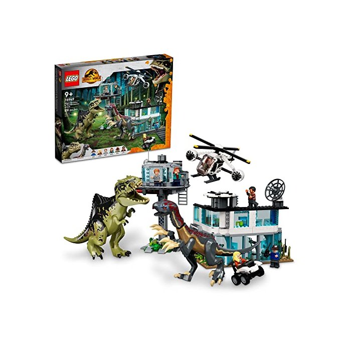 Os fãs de Jurassic World: Dominion podem reviver a ação épica do filme com o incrível conjunto de brinquedos Ataque do Giganotossauro e Terizinossauro (76949). Um presente legal para crianças que adoram dinossauros. Ele apresenta 2 figuras de dinossauros posáveis, um HQ construível com um laboratório detalhado, uma garagem para o carro ATV, uma torre de observação com função de plataforma colapsável e um helicóptero com rotores giratórios e compartimento de carga. Este conjunto de alta qualidade para maiores de 9 anos inclui 6 minifiguras LEGO Jurassic World com Owen Grady e Claire Dearing, para dar vida às histórias das crianças. Instruções ilustradas fáceis de seguir estão incluídas, para que até os iniciantes em LEGO possam construir com confiança e desfrutar do processo. Existem conjuntos de construção LEGO Jurassic World para encantar fãs de todas as idades, apresentando figuras de dinossauros, personagens populares, veículos legais e mais para diversão e exibição. O laboratório mede mais de 16 cm de altura, 21 cm de largura e 16 cm de profundidade. O Giganotossauro posável mede mais de 32 cm de comprimento. Contém 658 peças