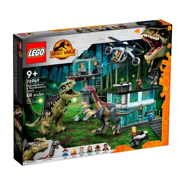 Os fãs de Jurassic World Dominion podem reviver ação do filme épico com o fabuloso conjunto de brinquedo Ataque do Giganotossauro e do Therizinossauro (76949). Um presente espetacular para crianças que gostam de lançar modas e que gostam de dinossauros, contém 2 figuras de dinossauro brinquedo ajustáveis, um centro de comando com laboratório detalhado para construir, uma garagem para o buggy off-road, uma torre de observação com função de plataforma que desaba, um helicóptero com hélices giratórias e um compartimento de carga.