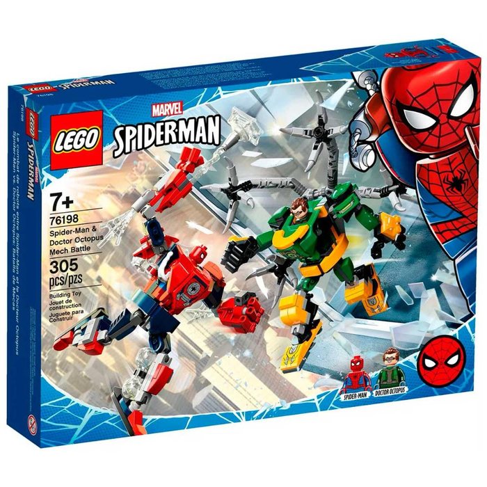 - Inclui minifiguras de Homem-Aranha e Doctor Octopus e respetivos robôs para construir com membros móveis, blasters de energia, teias, algemas e outros acessórios.