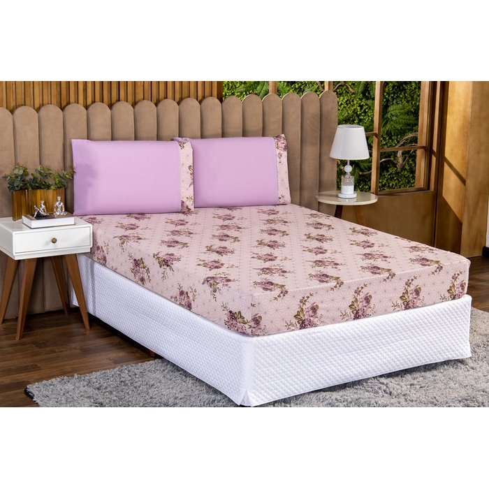 Lençol King Avulso com Elástico 180 Fios Algodão Estampado:floral-lilas