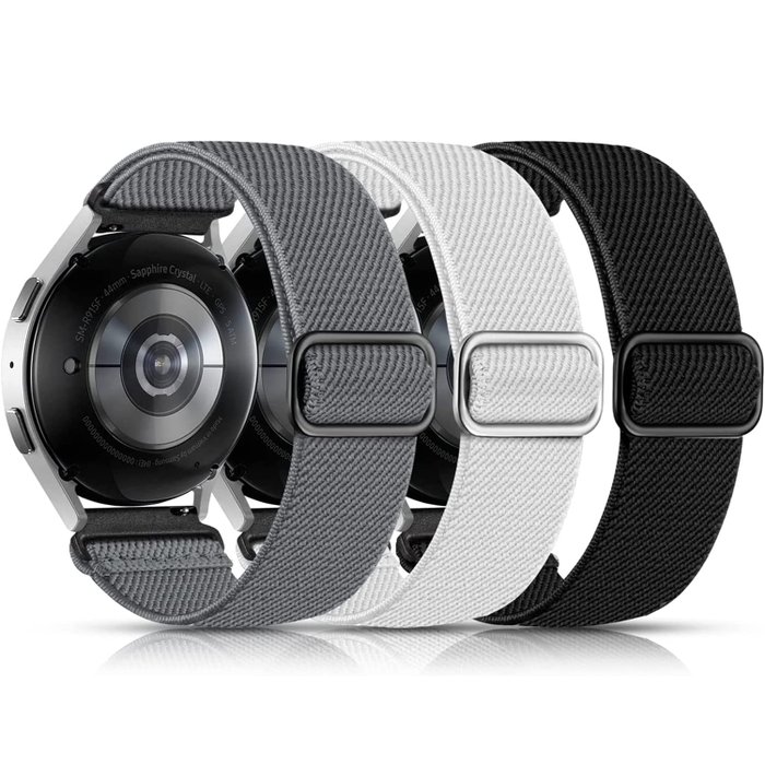 Lerobo 3 Pack Pulseiras Elásticas Compatíveis com Samsung Galaxy Watch 7/6/5/4 40mm/44mm, Galaxy Watch 6/4 Classic 42mm/46mm, Galaxy Watch 5 Pro 45mm, Active 2 - Nylon Ajustável para Homens e Mulheres - Cor Cinza Escuro/Branco/Preto