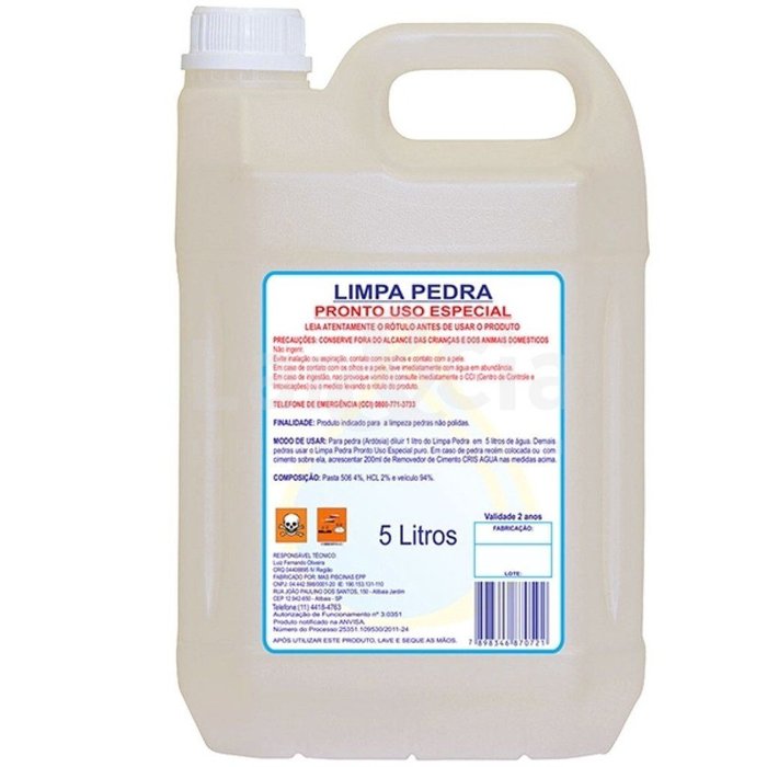 O Limpa Pedra Jomar CRIS ÁGUA é um produto de ação rápida, que proporciona uma limpeza eficaz, sem alterar a cor natural da pedra, sua ação remove incrustações e oxidações superficiais que tiram o brilho da pedra.FINALIDADE: Produto exclusivo para limpeza de PEDRAS NÃO POLIDAS.OBSERVAÇÃO: Este produto é PROIBIDO USAR EM PISOS ESMALTADOS OU CERÂMICAS.Instruções de Aplicação:1 ? Umedecer a pedra e aplicar o produto Limpa Pedra CRIS ÁGUA na pedra;2 ? Em seguida esfregar com vassoura de pelo;3 ? Deixar agir alguns minutos e antes que o produto seque, enxague.OBS: OBRIGATÓRIO O USO DE BOTAS E LUVAS DE BORRACHADOSAGEM:Limpa Pedra para ArdósiaDiluir 1 litro de Limpa Pedra JOMAR CRIS ÁGUA para cada 02 a 05 litros de água, de acordo com a sujidade.