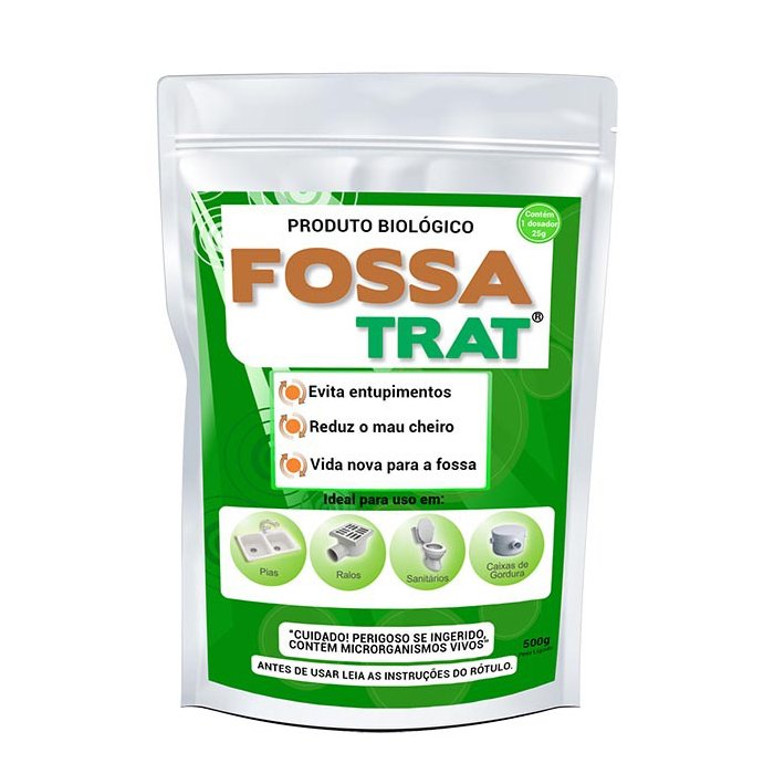 Fossa Trat (Fossatrat) é um produto com alta concentração de microrganismos naturais que degradam gorduras, proteínas e açucares, entre outros compostos orgânicos. Mantém limpas as tubulações, caixas de sépticas e fossa de instalações residenciais, comerciais e coletivas. Seu uso continuo ajuda a eliminar o mau cheiro e a evitar entupimentos, dispensando limpezas mecânicas. Apresenta-se na forma de sólido granular marrom com odor característico de farelo de trigo.