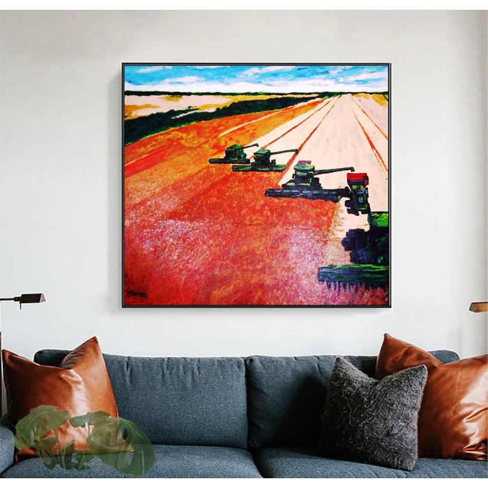 Lindo Quadro Decorativo Original Pintado a Mão de Colheita Mecanizada em Fazenda Moderna vermelho, verde, bege